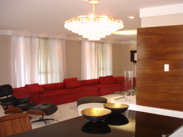 Nessa casa no Cond. Busca Vida, aproveitamos toda extensão do living com um mega sofá de 6m, misturando estar e home num só ambiente.