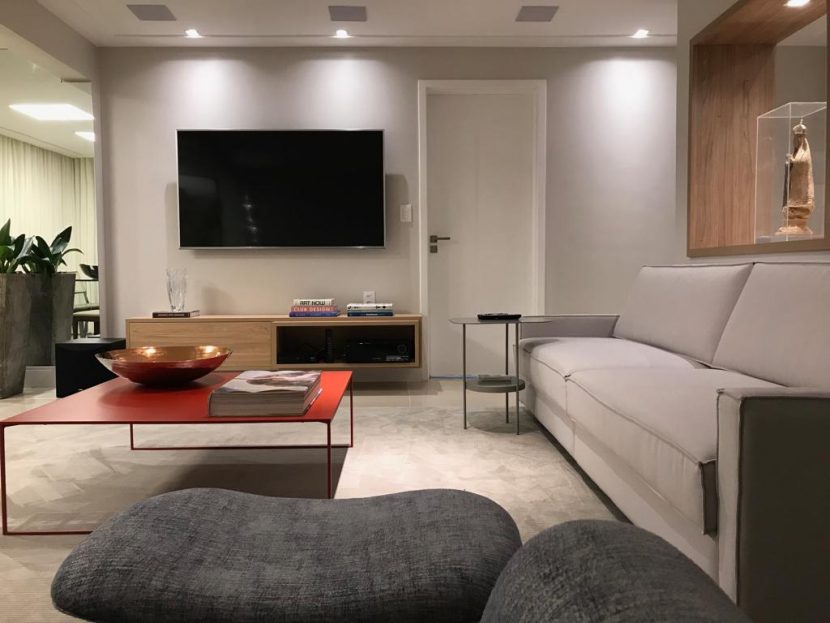 Abrimos mão da varanda em prol de uma boa sala de jantar. Com isso, formatamos um living/Home, amplo, confortável e elegante, onde a família se reúne, recebe amigos e se diverte.